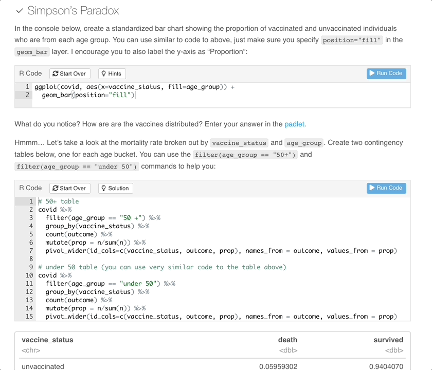 LearnR: R Markdown is an extremely versatile file type which allows R users to create high-quality documents for disseminating…. well… lots of things! R Markdown files allow users to generate PDFs and HTML documents which seamlessly switch between here. The package learnR provides tools for converting R Markdown documents into interactive tutorials. Using learnR, one can create html files which contain R consoles (boxes where you can run R code) referred to as “exercises”. As an instructor you can use these tutorials to teach students how to apply new concepts in R but leveraging exercises to appropriately scaffold the content students.
